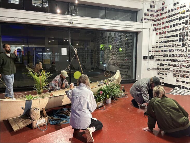 On Friday night, the Xeno-space truly reached its height. A few visitors remained, those who had been working had begun to mill about, drinks in hand, then sounds of drilling could be heard as Ismael and Rob began to turn the canoe into an instrument. Between them they played it, with Ismael using his hands, a bow, parts of the sculpture, a sweet potato to pluck at the string spanning the length of the boat. Everyone gathered around slowly until we were all there and the energy, the excitement was palpable. The potential of the exhibition really became clear in that moment, as the artists worked collaboratively, as one artwork took over another and the barriers between the pieces were dismantled. What was traditionally valuable – a centrepiece of the exhibition – became one of Rob’s “unprecious” instruments, and art became a moment of connection, between artists, between them and their audience.